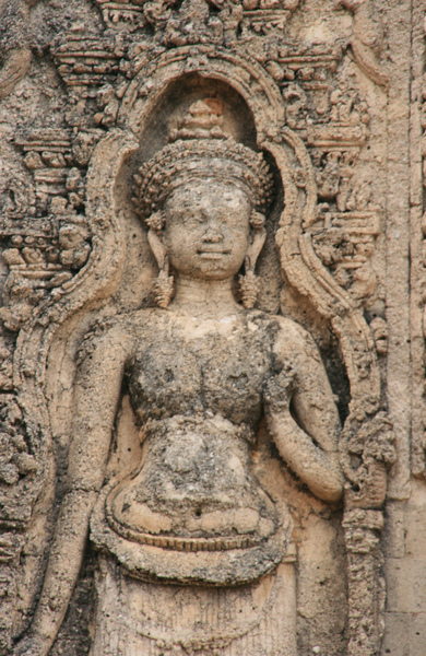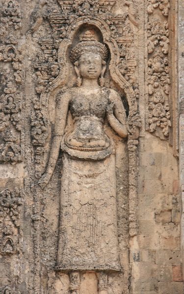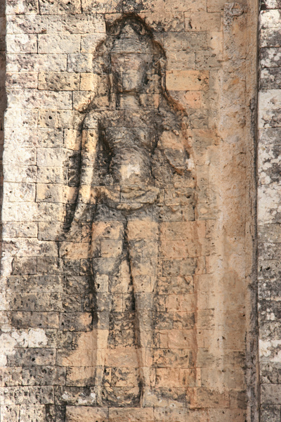 在變身塔的外面,分別由男神和女神守護,其中最特別的是西南塔的兩尊守護女神,內側的是毗濕奴的神妃拉克希米,而在外守護的女神,則為女神辯才天(Saraswati),她是梵天神(Brahma)的配偶。(妹妹補充:為啥所有我查的到的網誌都說是「四臂四頭的波羅密是梵天神的神妃呢?四臂四頭應該是指梵天神吧?祂原本有五頭,因為娶了自己的女兒而被破壞神濕婆砍掉第五頭。」)