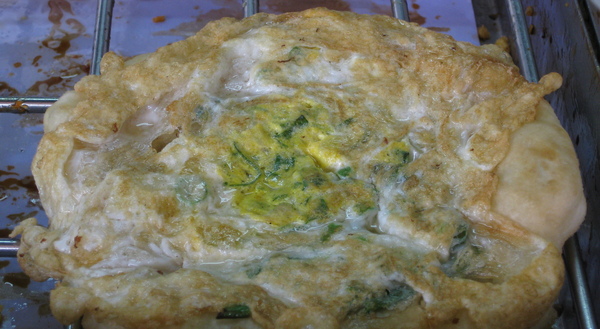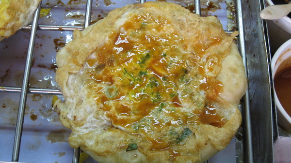 大部分都是將蔥揉在麵皮裡頭,而它們卻是打顆蛋、灑上一把蔥,接著再將餅皮給蓋了上去。