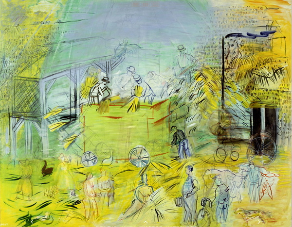 原本這種屬於低下階層的題材是不可能出現在杜菲的畫作之中,他總是認為自己的畫是要將法國的美好展現在眾人的面前,所以畫的內容都是些紙醉金迷的事物;直到有一天,德薩克伯爵夫人在她位於聖-利澤爾的產業接待杜菲的時候,他發現這些收成農事的行為熱情又奔放、並且充滿了歡愉與滿足,這不也是法國的美好嗎?