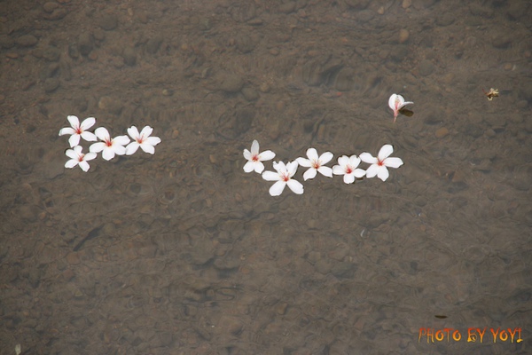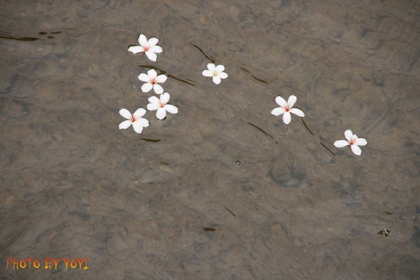 當風輕拂、花兒便靈靈巧巧地落在水面、搖蕩。