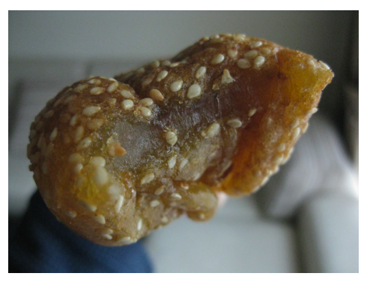 除了芝麻球外,還有一種是將青豆子裝在鐵網製成的盒子(有點兒像是捕鼠器。)放在炭火上烤,