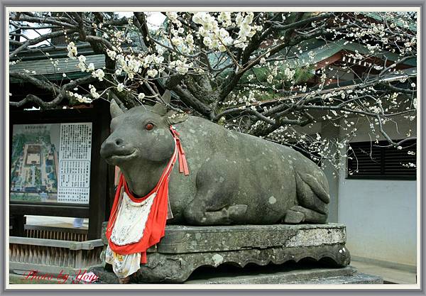 在北野天滿宮裡有很多的牛,石牛、銅牛,據說裡面有一頭銅牛摸它的頭就能夠增長智慧、聰明百倍,