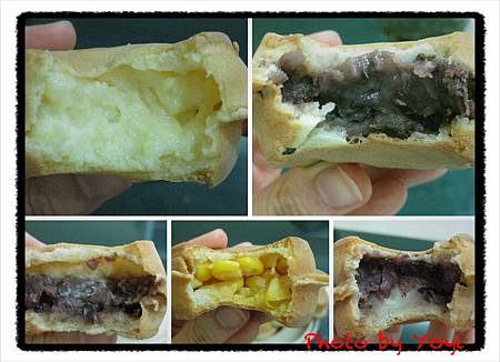從左上、右上,到左下至右下分別為【奶油、紅豆、雙拼(奶油+紅豆)、起士玉米、紅豆麻糬】,